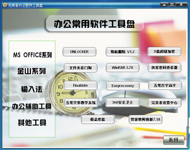 考慮到辦公過程中有加密及刪除的需要,本光盤還準(zhǔn)備了部分加密及刪除頑固文件的軟件。另外辦公中最擔(dān)心的是文件丟失或無意刪除無法找回,本光盤又特意準(zhǔn)備了Finaldate等知名還原軟件。