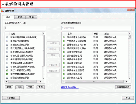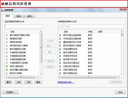 金山詞霸破解版基本包內(nèi)含金山詞霸2009主程序及《新牛津英漢雙解大詞典》等10本本地詞典。其余詞典、句庫(kù)、語(yǔ)音等需要聯(lián)網(wǎng)。